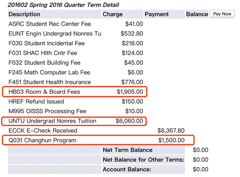 这是学姐开始学习专业课后的成绩单,第一个圈圈HB03是宿舍费,UNTU是学费,Q031是合作办学的奖学金。