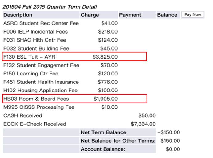 这是一份学姐在语言班的账单截图,第一个圈圈里的F130便是语言班一个学习的学费。第二个圈圈HB03是住宿费,因为第一年住在学校宿舍,所以会在账单上有所显示。
