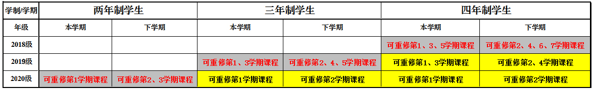 8.毕业班的学生在重修报名时务必认真核对,不要错报漏报,影响正常毕业,本学期和下学期重修报名学期范围参看表: