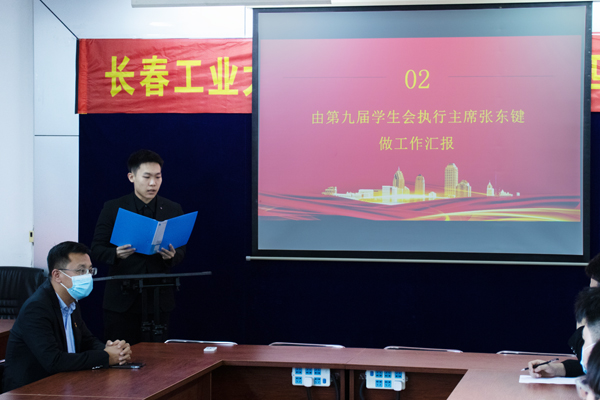 第九届学生会执行主席张东键作上一届学生会工作报告。报告中张东键同学从三个方面:全面深化改革,落实自查体系、加强思想引领,强化理论武装、寻求工作创新,提高活动质量,阐述了第九届学生会的相关工作,并对第十届学生会给予了宝贵的经验和建议。